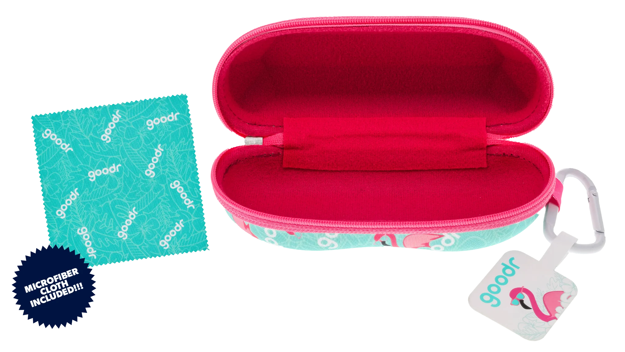 Keep your goodrs safe and sound with our Best Case Scenario, a zipper-enclosed sunglasses case with a snuggly soft inside lining to keep your sh ades cozy and protected. Adorned with pink flamingos on a teal tropical background, this case is as stylish as the sunnies inside.